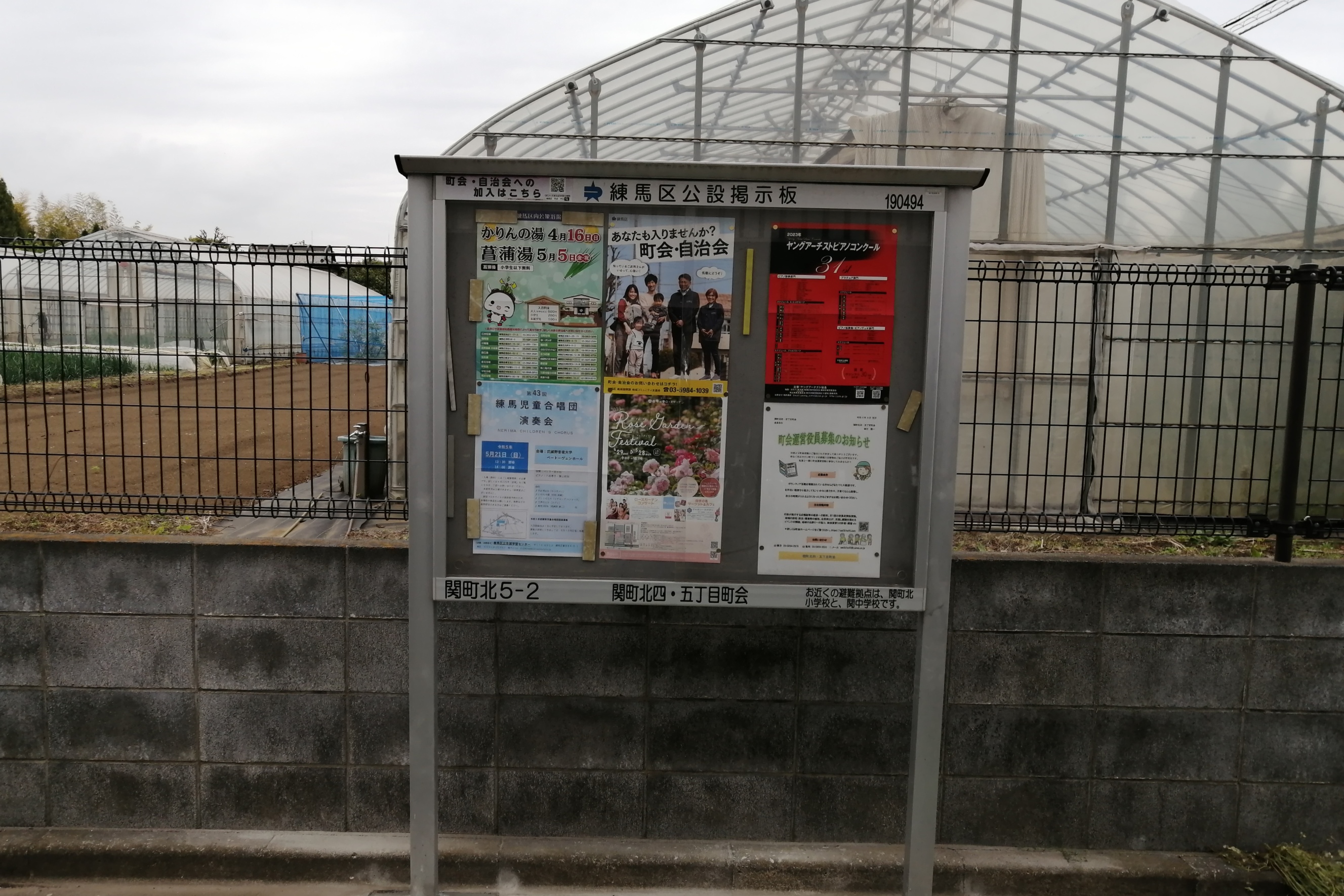 練馬区公設掲示板とは、行政情報など公共的な情報を地域の区民に広く提供するため、練馬区が設置した掲示板です。サイズは縦:約88cm、横:約1m13cm。練馬区が設置している公設掲示板は区内に900基あり、そのうちの11基を関町北四・五丁目町会で毎月二回、掲示物を最新のものと貼り換えています。掲示物は防犯・防災に関するものやコンサート、スポーツ、お祭りなどのイベント情報、各種募集、議会のお知らせなど大切な情報ばかりで公設掲示板は地域の皆様にとってとても重要な情報源となっています。
