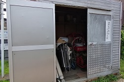 防火防災倉庫は、地域防災の備えとして、消耗品などが保管・備蓄されている倉庫です。倉庫内には様々な物資が用意され、火災や震災などが発生した場合、被害を受けにくい構造をしており、災害発生時に被災者の生命や財産を守る物資を提供。保管されているものは、可搬消防ポンプ、災害用簡易トイレセット、ホース、防火服、ヘルメット、担架、リヤカー、救急箱、メガホン、ライト、救出用具一式(スコップ、バール、ハンマー、ツルハシ等)。可搬消防ポンプは年に一回のメンテナンス(キャブレータ清掃やプラグ交換など)も行っています。