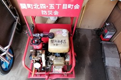 地震等の災害が発生した時に、区民が活用出来る消火資機材。軽量で操作も簡単な上、毎分100リットル以上の放水が可能です。(2022.6.5)