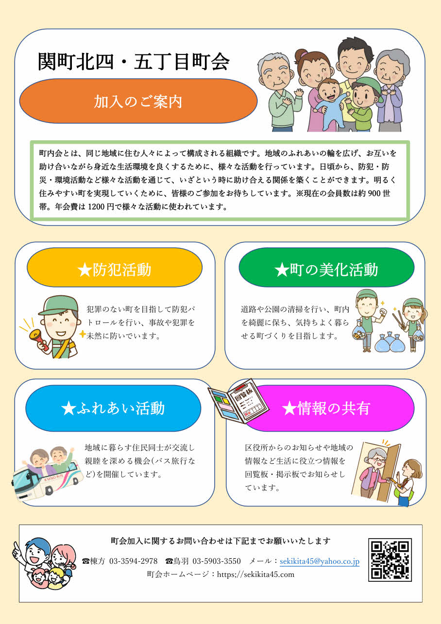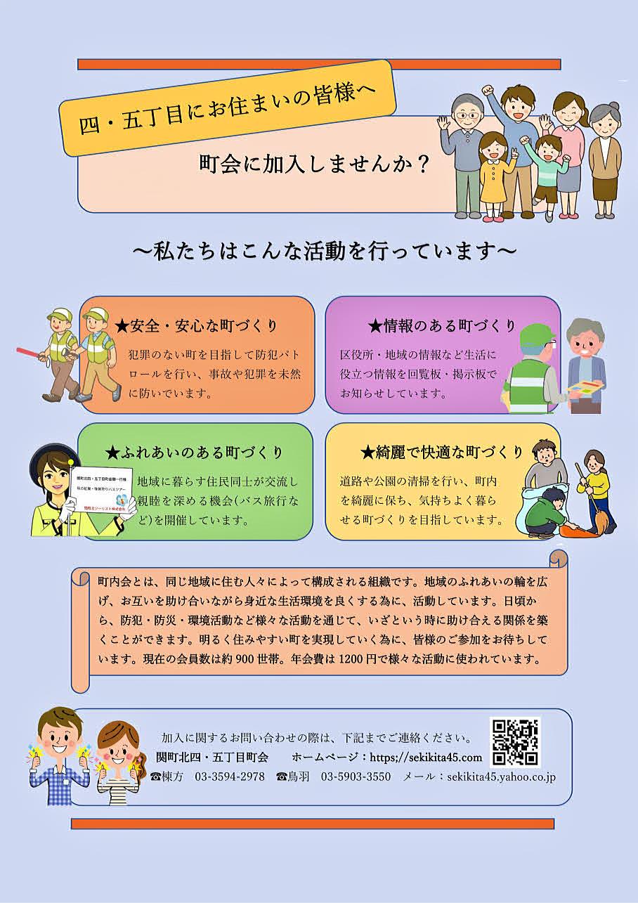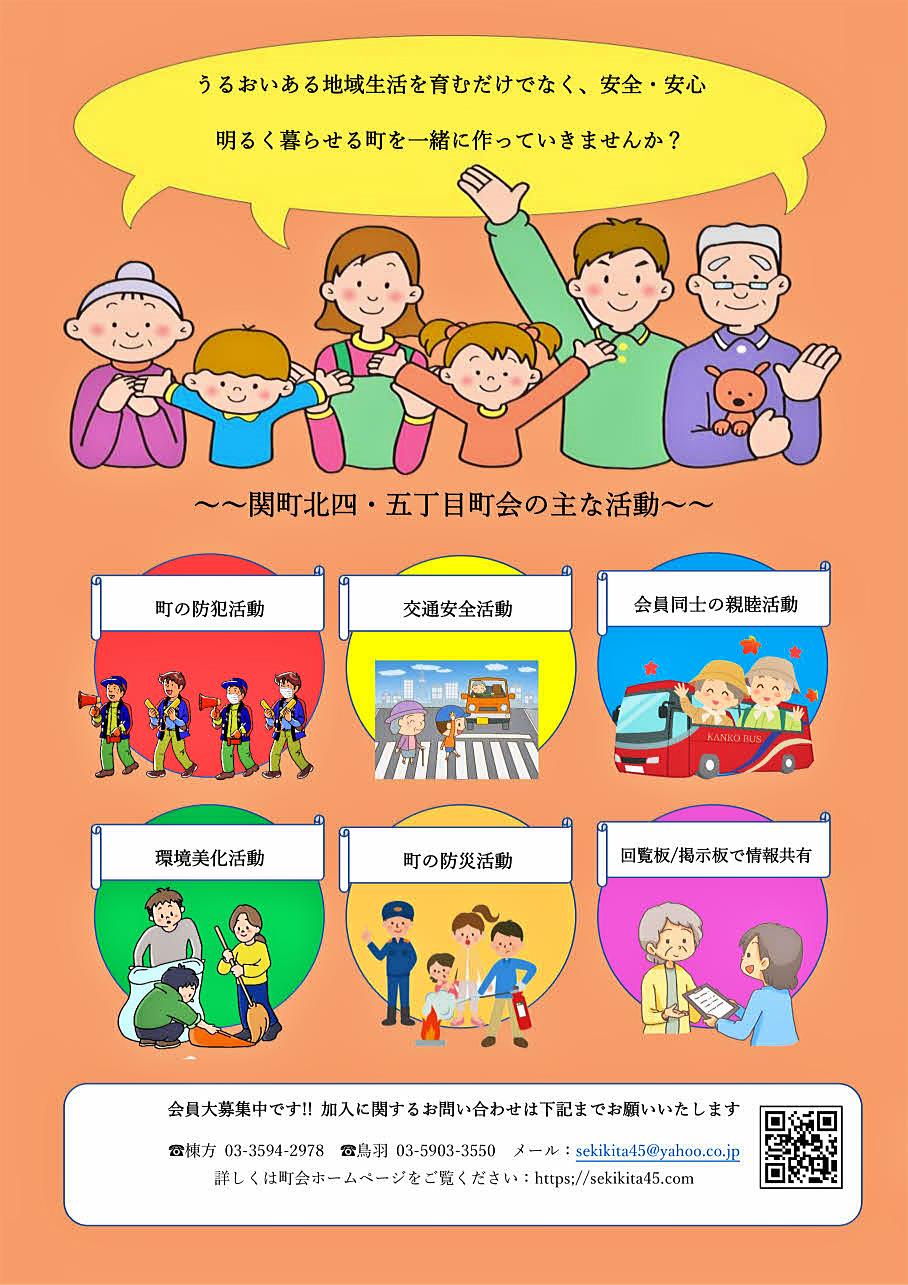 町会に加入し一緒に活動してみませんか?関町北四・五丁目町会では年間を通じて多くの活動・行事を行っています。町会員だけを対象とした活動・行事もありますが、夏祭り、全国交通安全運動、町内のパトロールなどがあり、関町北四・五丁目のお役に立っているものと思います。